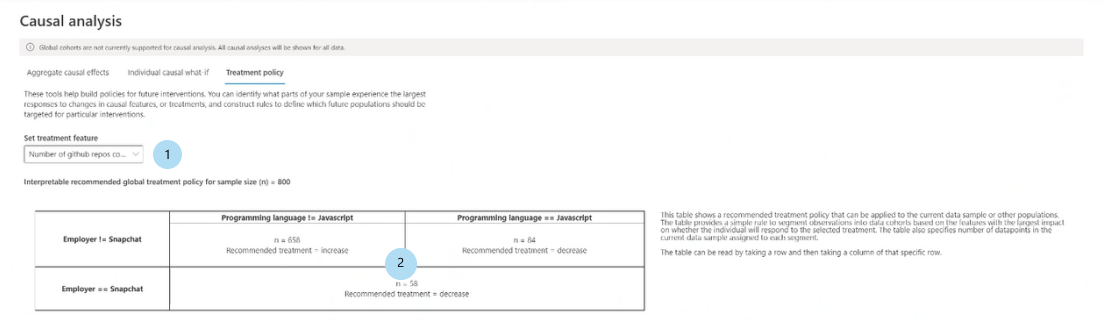 - 选择任何单个数据点,干扰其处理特征,并查看支持因果假设结果的预期因果结果。 此分析仅适用于回归机器学习方案。