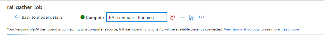 计算处于“正在运行”状态后,负责任 AI 仪表板将开始连接到该计算实例。 为了实现此连接,仪表板会在所选计算实例上创建终端进程,并在终端上启动负责任的 AI 终结点。 选择“查看终端输出”以查看当前终端进程。
