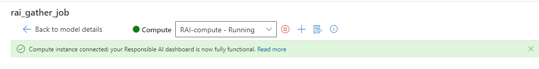 当 Responsible AI 仪表板连接到计算实例时,您会看到一条绿色信息栏。 仪表板现已完全正常运行。