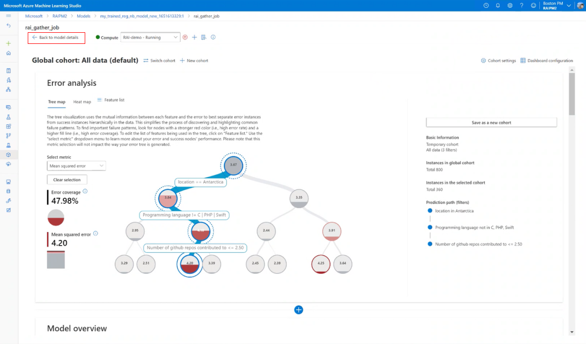 错误分析组件的第一个选项卡是树状图。 它通过树形可视化展示了模型失败如何在各种队列中分布。 选择任意节点以查看发现错误的特征的预测路径。