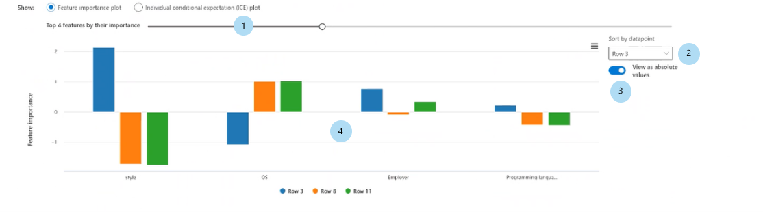 下图演示了特征如何影响对特定数据点做出的预测。 可以选择最多五个数据点来比较特征重要性。