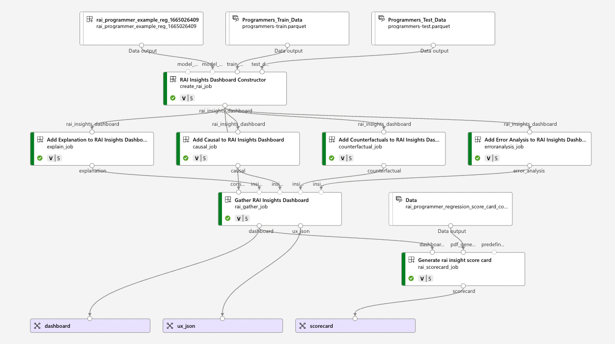 通过使用负责任 AI 组件,你可以通过管道作业生成负责任 AI 仪表板和评分卡。 六个核心组件可帮助你创建负责任的 AI 仪表板以及几个帮助程序组件。 示例试验图如下所示: