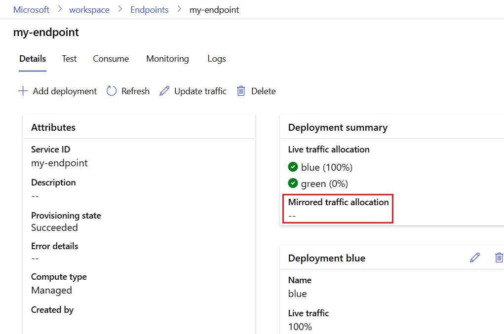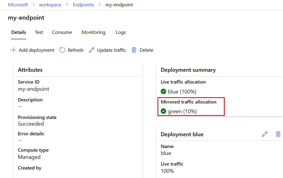 green部署)部署到终结点,但不向该部署发送实时流量。 - 在隔离环境中测试