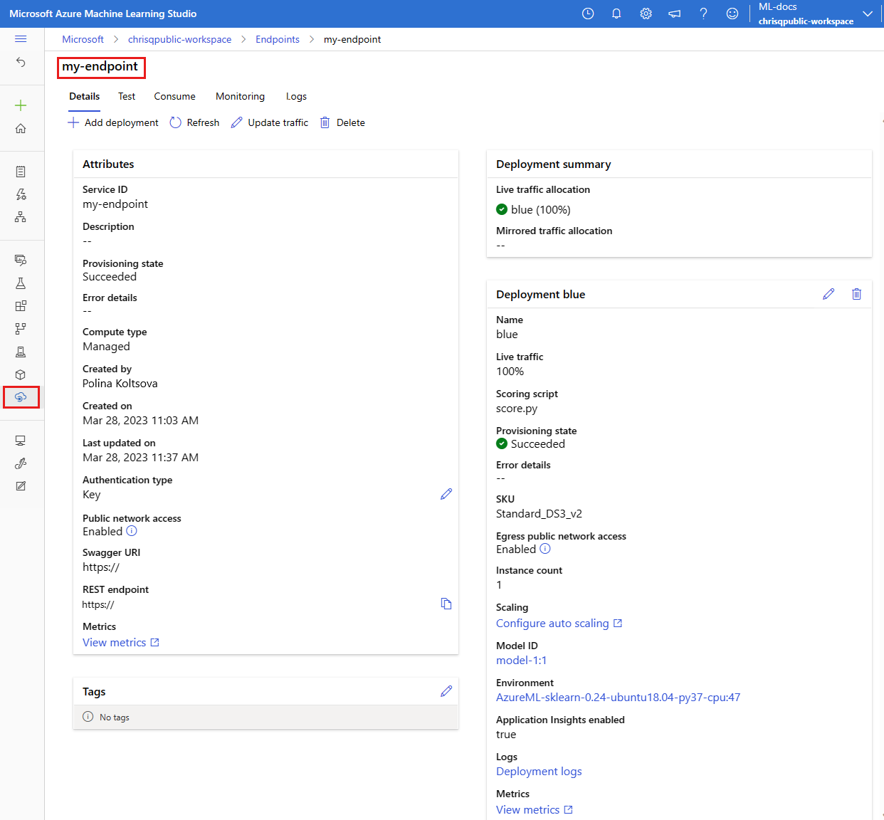 az ml online-deployment show --name blue --endpoint $ENDPOINT_NAME