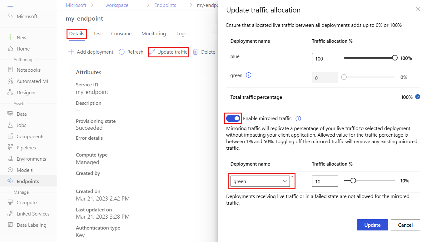 az ml online-endpoint update --name $ENDPOINT_NAME --mirror-traffic "green=10"