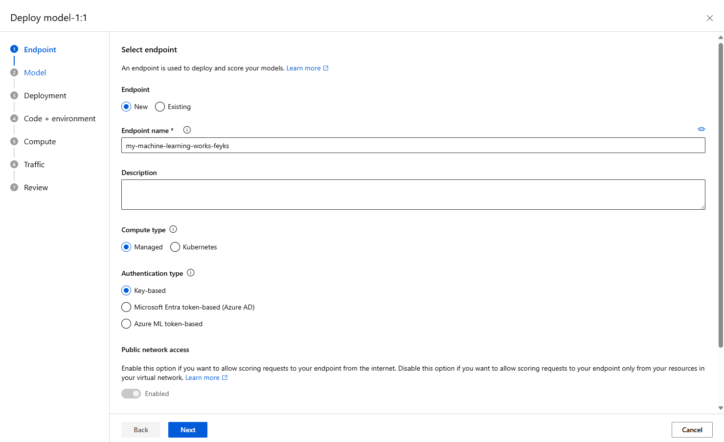 | 身份验证模式 | 可选 | 终结点的身份验证方法。 在基于密钥的身份验证、Azure Machine Learning 基于令牌的身份验证aml_token和 Microsoft Entra 基于令牌的身份验证aad_token之间进行选择。 密钥不会过期,但令牌会过期。 有关身份验证的详细信息,请参阅 对联机终结点的客户端进行身份验证。 |