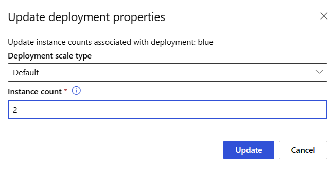 az ml online-deployment update --name blue --endpoint-name $ENDPOINT_NAME --set instance_count=2