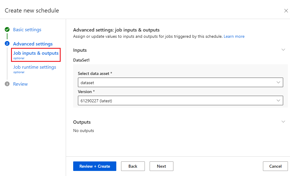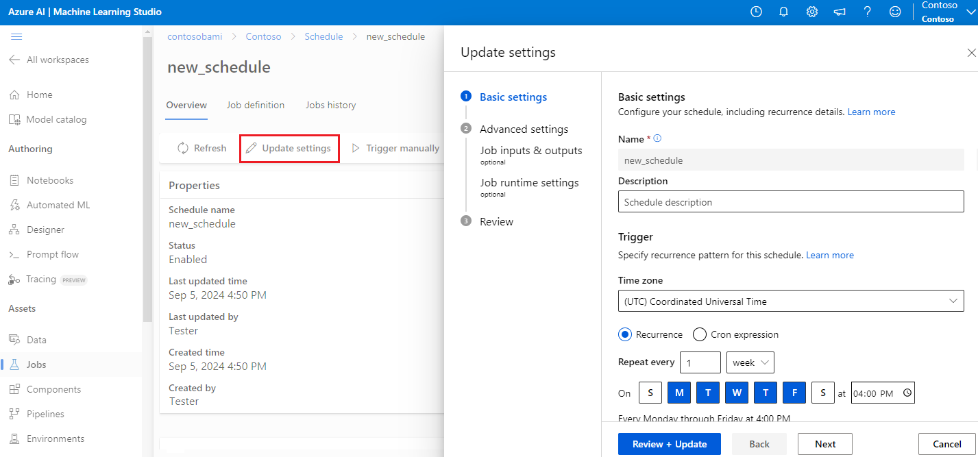 定义计划时,可以更改运行管道作业时要使用的 settings、inputs 或 outputs。 还可以更改已触发作业的 experiment_name。