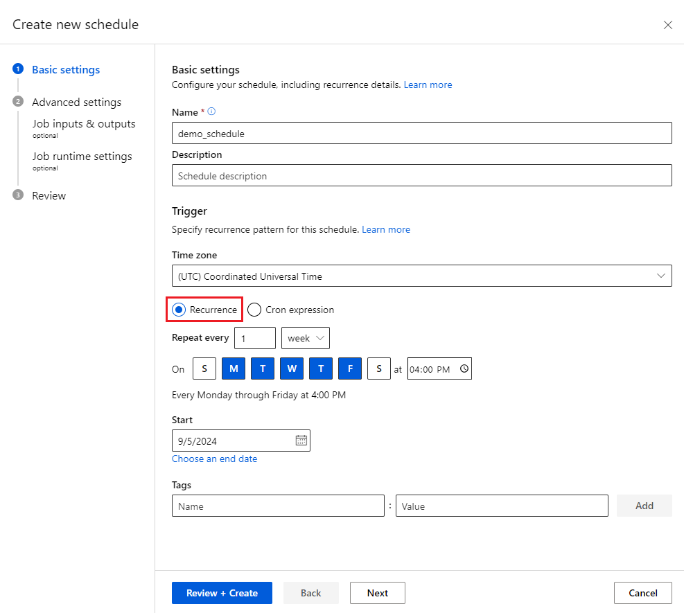如果管道作业具有令人满意的性能和输出,则可以设置计划以定期自动触发作业。 为此,必须创建一个用于将作业与触发器相关联的计划。 触发器可以是 recurrence 模式,也可以是指定作业运行间隔和频率的 cron 表达式。