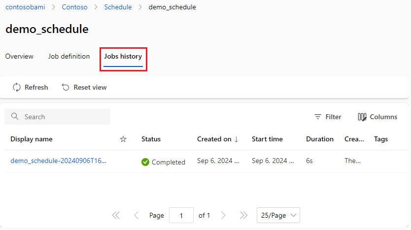 工作室中计划详细信息页面上的“作业历史记录”选项卡提供了一种简单方式来查找计划触发的所有作业。