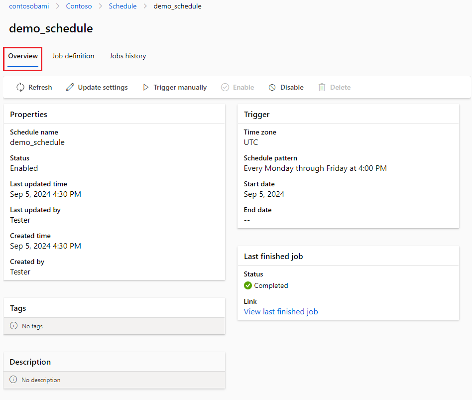 特定计划触发的作业都具有显示名称 <schedule_name>-YYYYMMDDThhmmssZ。 例如,如果名为 named-schedule 的计划从 2021 年 1 月 1 日上午 6 点开始每隔 12 小时运行一次,则创建的作业的显示名称如下: