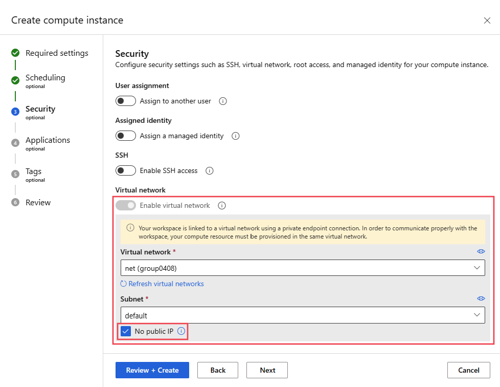 在“高级设置”中,选择“启用虚拟网络”、你的虚拟网络和子网,最后选择“VNet/子网”部分下的“无公共 IP”选项。