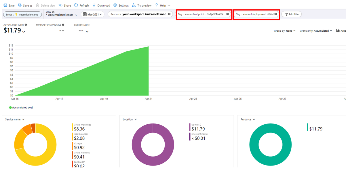 了解如何查看托管联机终结点的成本。 关联的工作区会为您的端点产生成本。 可以使用标记来查看特定终结点的成本。