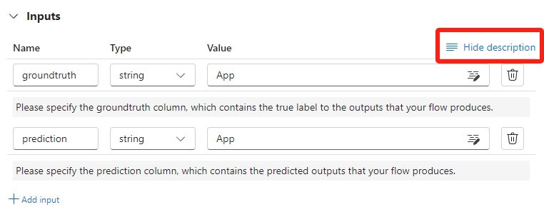 若要为每个输入添加说明,请在开发评估方法时在输入部分选择“显示说明”,然后输入说明。