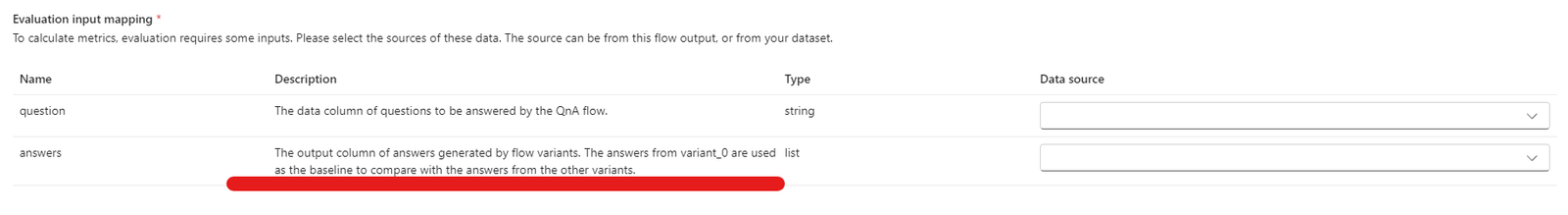 ${run.outputs.[OutputName]}如果数据来自测试数据集,则将源设置为${data.[ColumnName]}。 为数据输入设置的任何说明也会在此处显示。 有关详细信息,请参阅 提交批处理运行以评估流。重要