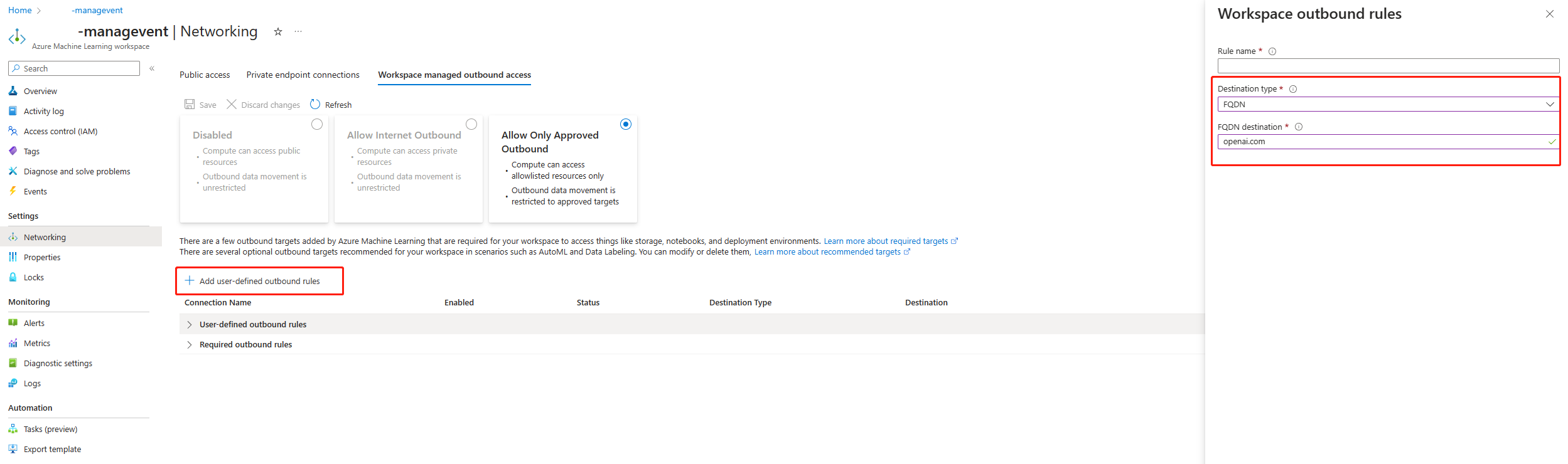 - 工作区:将 Azure 机器学习工作区配置为专用工作区,并限制其入站和出站流量。