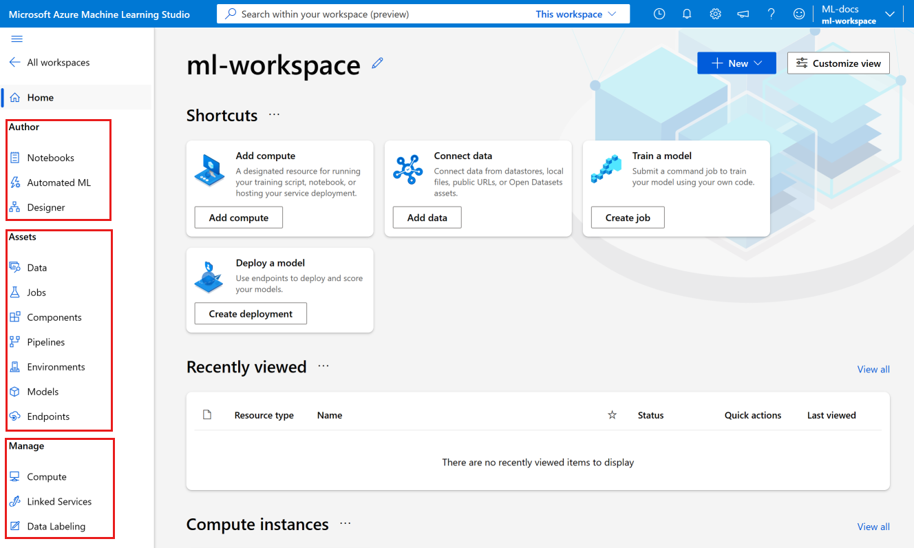 - 工作区。 若要使用 Azure 机器学习,需要一个工作区。 工作区是用于查看和管理所创建的全部项目和资源的中心位置。