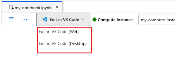 可在此处运行笔记本,或者在 VS Code 中将其打开,以获得具有 Azure 机器学习资源强大功能的完整集成开发环境 (IDE)。 选择“在 VS Code 中打开”,然后选择 Web 或桌面选项。 以这种方式启动时,VS Code 将附加到计算实例、内核和工作区文件系统。