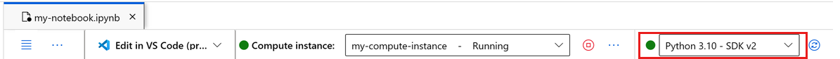 Python 3.10 - SDK v2。 如果不是,请使用下拉列表选择该内核。如果没有看到该内核,请验证计算实例是否正在运行。 如果它正在运行,请选择笔记本右上角的“刷新”按钮。