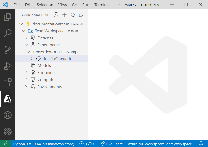 在 Visual Studio Code 中,从示例存储库中打开 azureml-examples/cli/jobs/single-step/tensorflow/mnist 目录。
