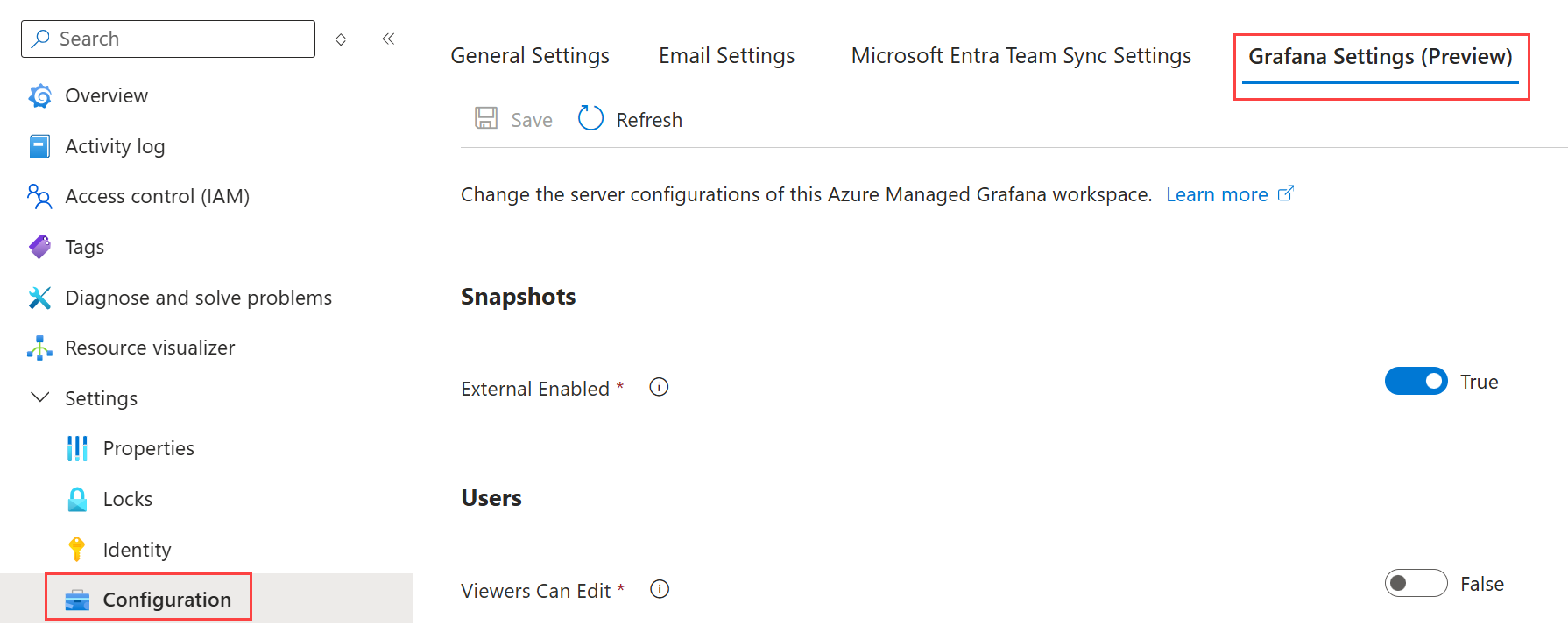 本文提供有关如何在 Azure 托管 Grafana 中配置 Grafana 设置的分步说明。 您可以通过这些设置启用或禁用特定选项,从而自定义您的 Grafana 实例。 Grafana 文档中的 Grafana 配置中也提到了这些 Grafana 设置。