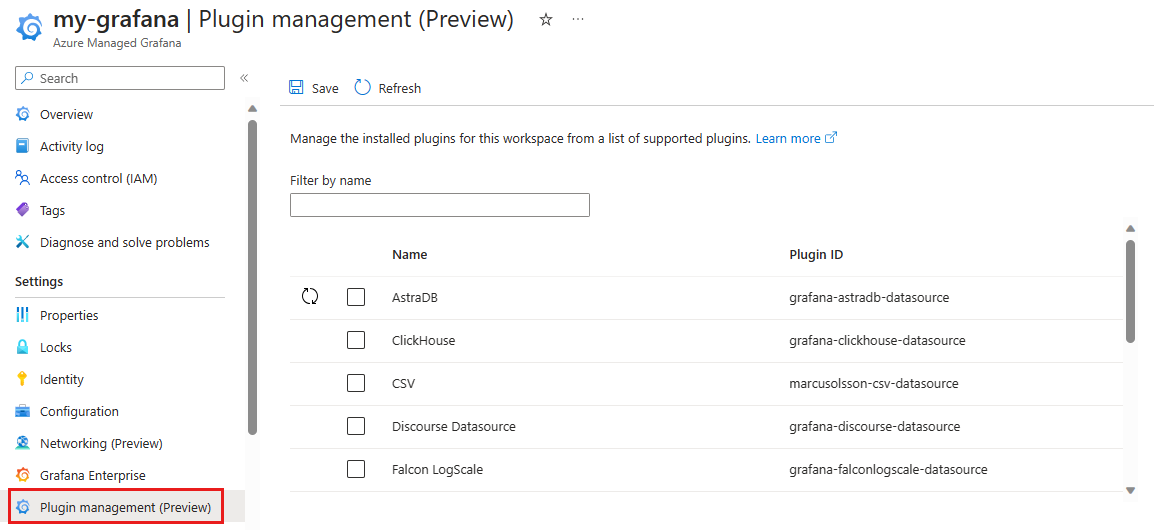 在此阶段,无法从 Grafana UI 或 Azure CLI 安装和删除插件。 插件管理是通过 Azure 门户中的 Azure 托管 Grafana 工作区完成的。