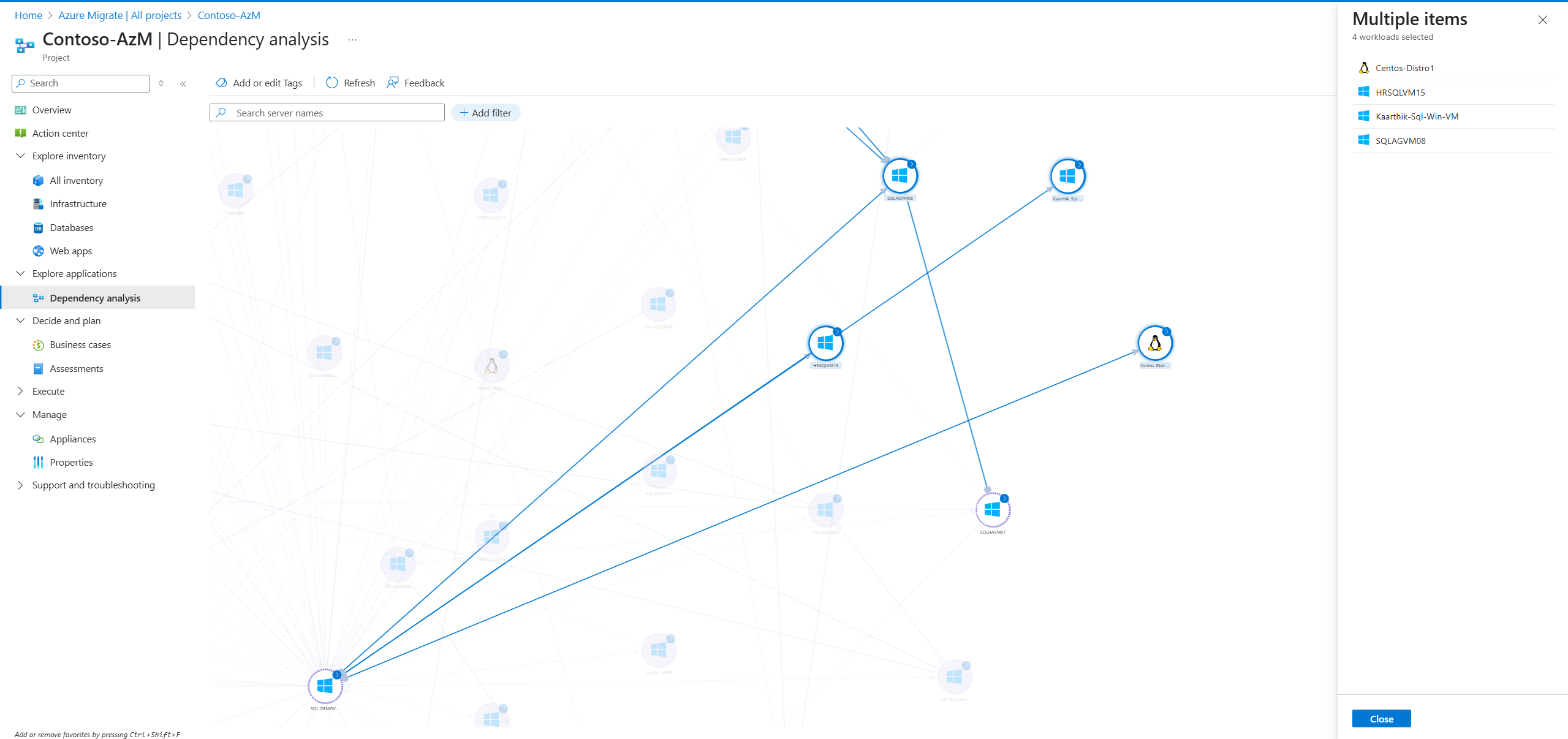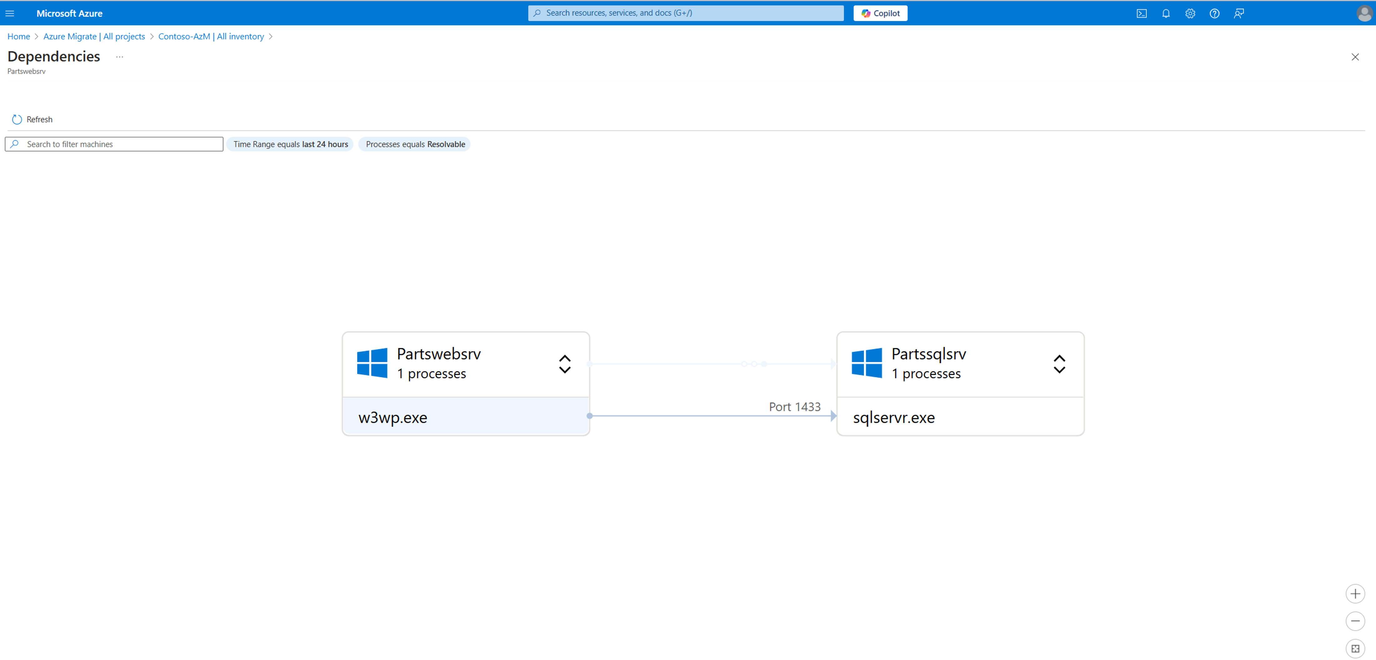 在从设备启动检测后,您可以访问 Azure 门户上的 Migrate 迁移项目并查看依赖项数据。 建议等待 至少 24 小时 ,以便为服务器收集足够的依赖项数据,并在可视化效果中显示。