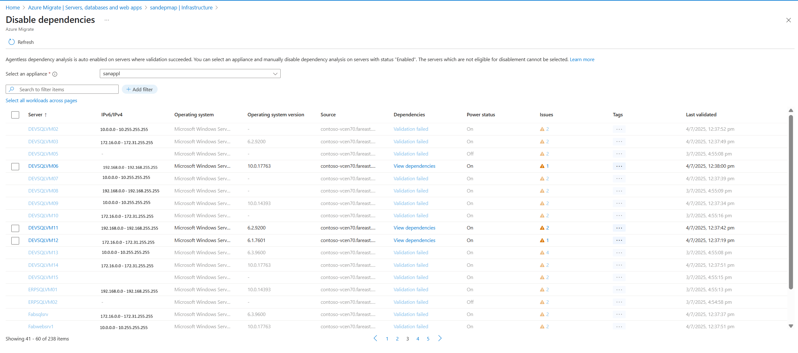 2. 可以筛选服务器以禁用自动启用的依赖项分析(状态为 “已启用”的服务器)。 无法选择不符合禁用条件的服务器,例如状态 验证失败未启动禁用凭据 不可用的服务器。