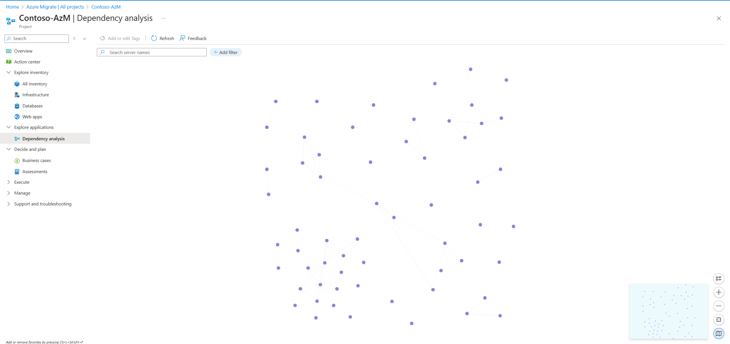 在从设备启动检测后,您可以访问 Azure 门户上的 Migrate 迁移项目并查看依赖项数据。 建议等待 至少 24 小时 ,以便为服务器收集足够的依赖项数据,并在可视化效果中显示。