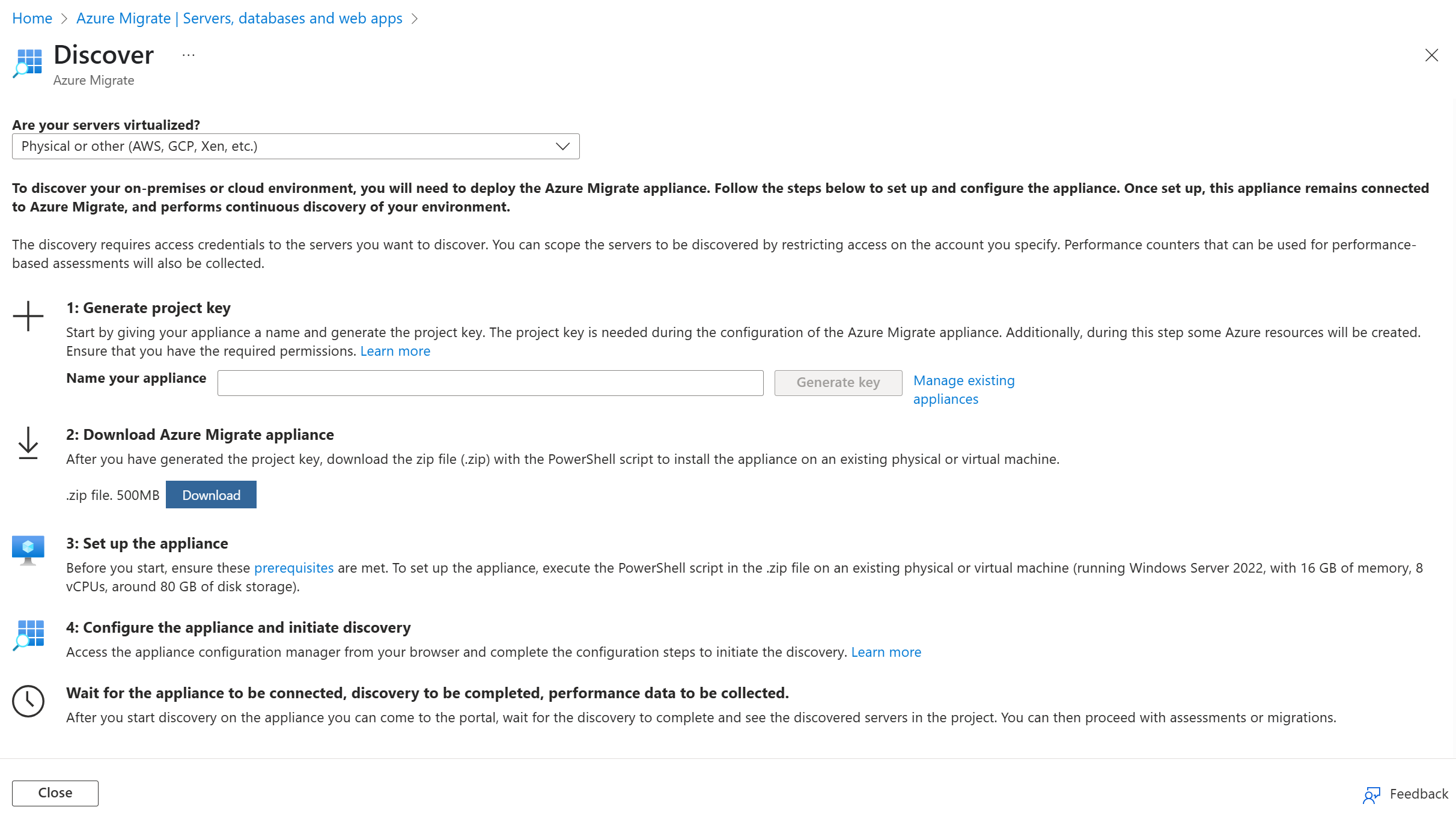 本文介绍如何设置 Azure Migrate 设备以发现在 AWS、GCP 或任何其他云中运行的物理服务器和服务器。