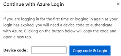 若要注册设备,请选择“登录”。 在 继续使用 Azure 登录 中,选择 复制代码和登录 以复制设备代码。 需要此代码才能登录到 Azure。 浏览器将打开一个新的选项卡,其中包含 Azure 登录提示。 请确保关闭弹出窗口拦截器以看到提示信息。