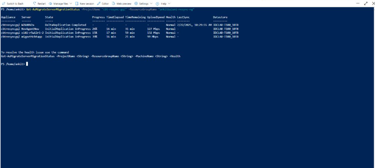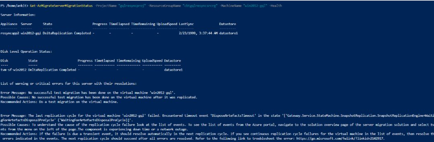 -Health标志会显示 错误、可能的原因和建议措施,用于排查迁移问题。Get-AzMigrateServerMigrationStatus -ProjectName "<your-project-name>" -ResourceGroupName "<your-resource-group>" -MachineName "<your-server-name>" -Health运行此命令并获取以下输出: