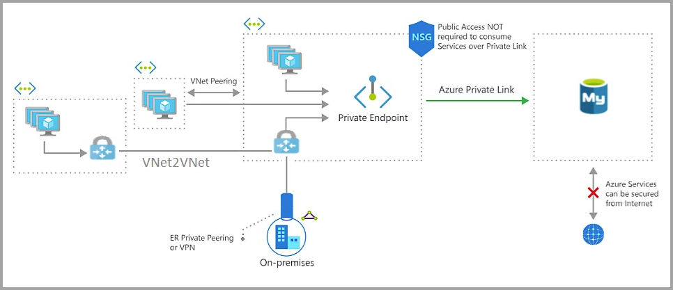 借助专用链接,你可以使用 Express Route (ER)、专用对等互连或 VPN 隧道实现对专用终结点的跨界访问。 随后,它们可以禁用通过公共终结点的所有访问,而不使用基于 IP 的防火墙。
