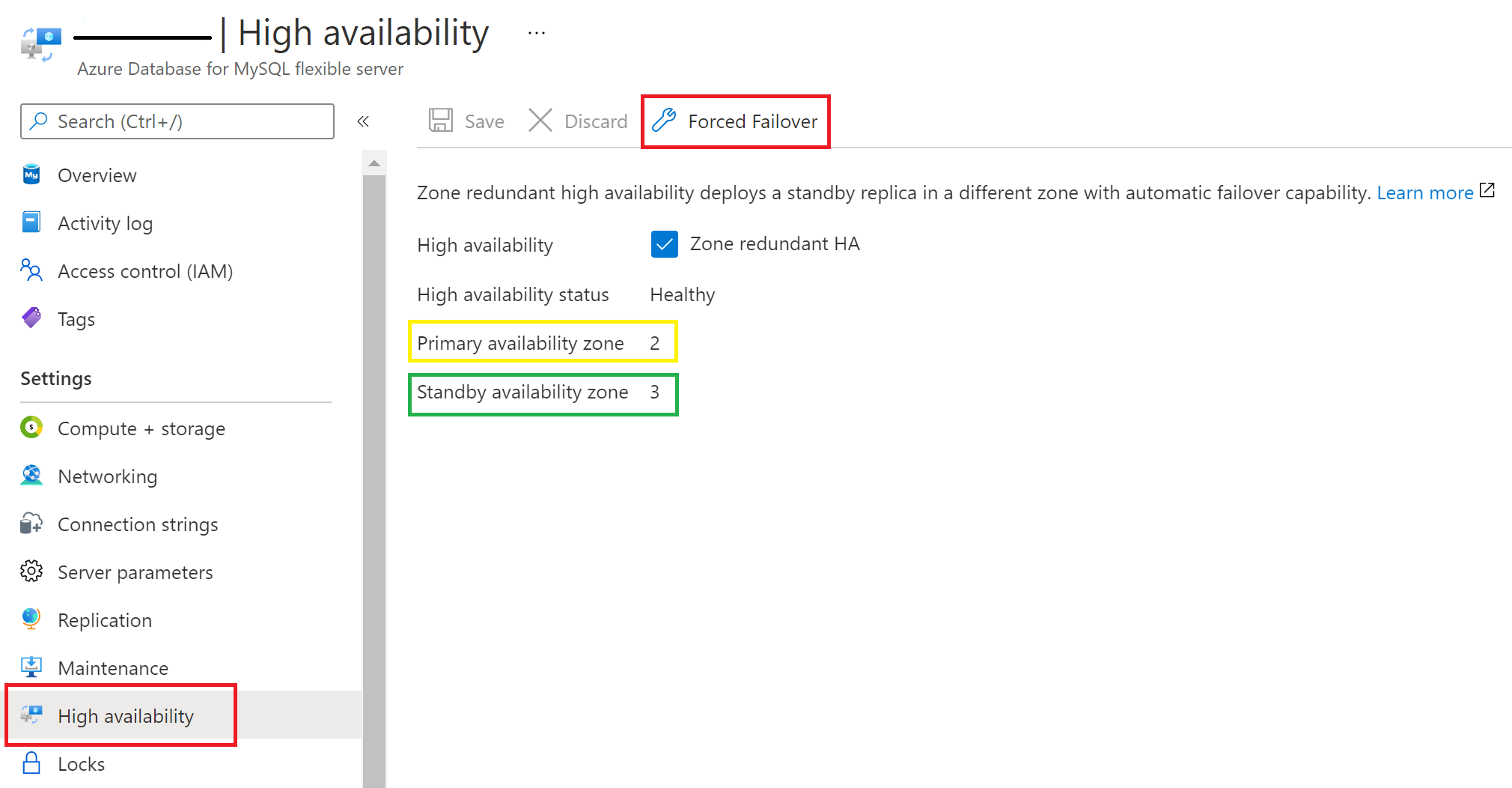 按照以下步骤操作,以将 Azure Database for MySQL 主灵活服务器实例强制故障转移到备用灵活服务器实例。