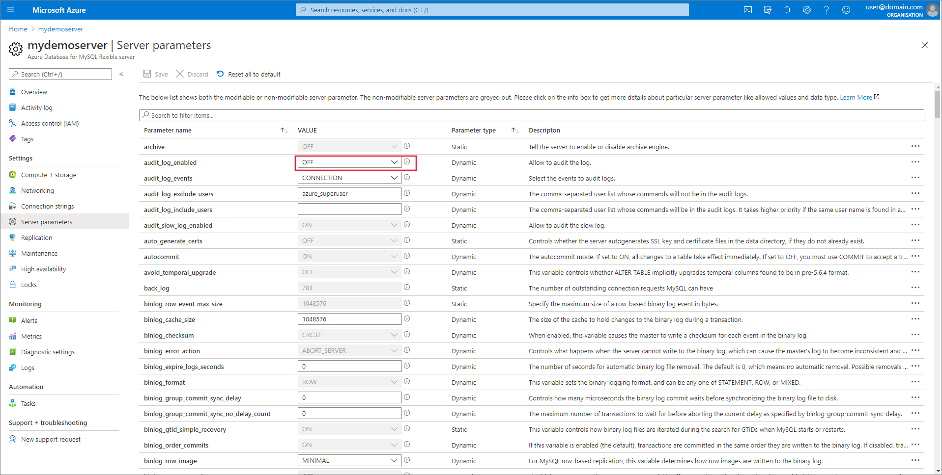 - 在“设置”部分下,选择“服务器参数”以打开 Azure Database for MySQL 灵活服务器实例的服务器参数页。