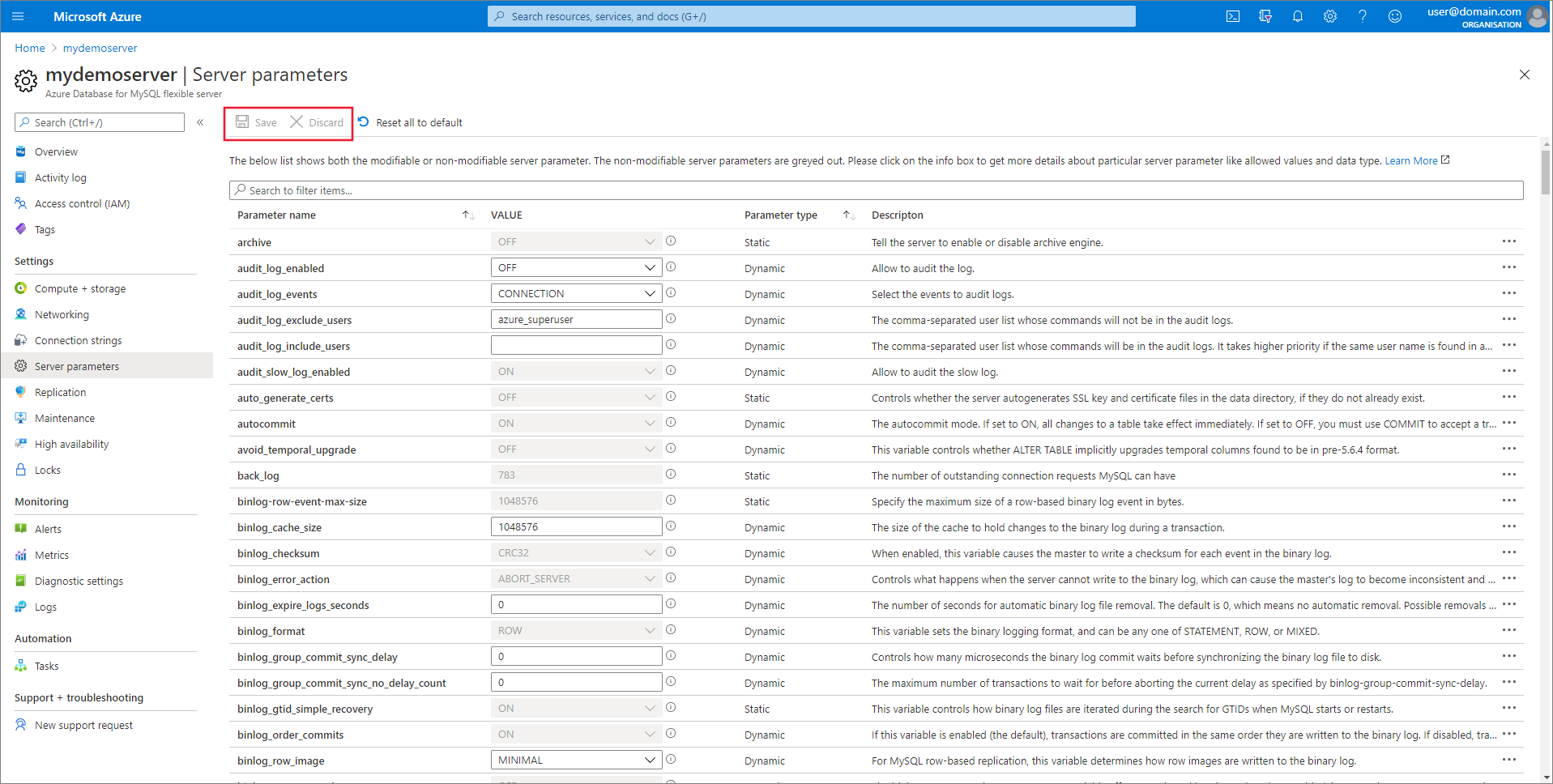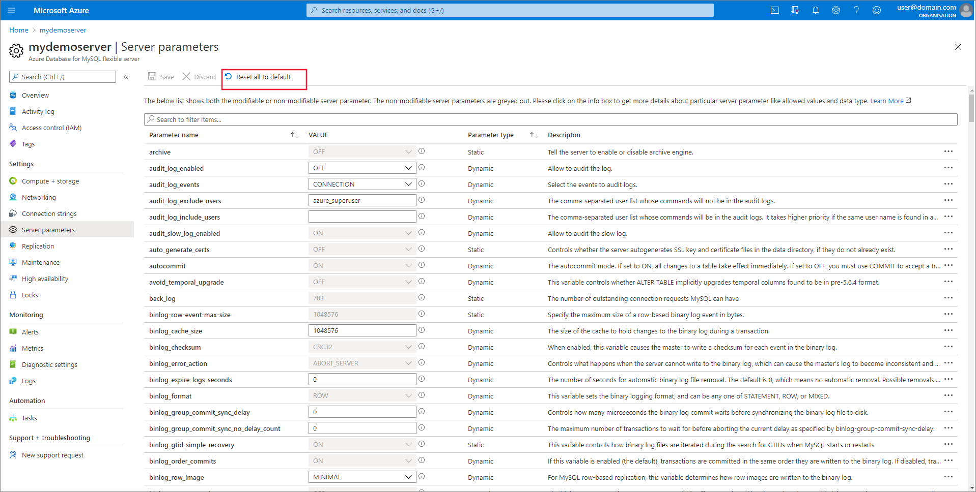 本文介绍如何使用 Azure 门户查看和配置服务器参数。 Azure 门户上的服务器参数边栏选项卡将同时显示可修改和不可修改的服务器参数。 不可修改的服务器参数将灰显。