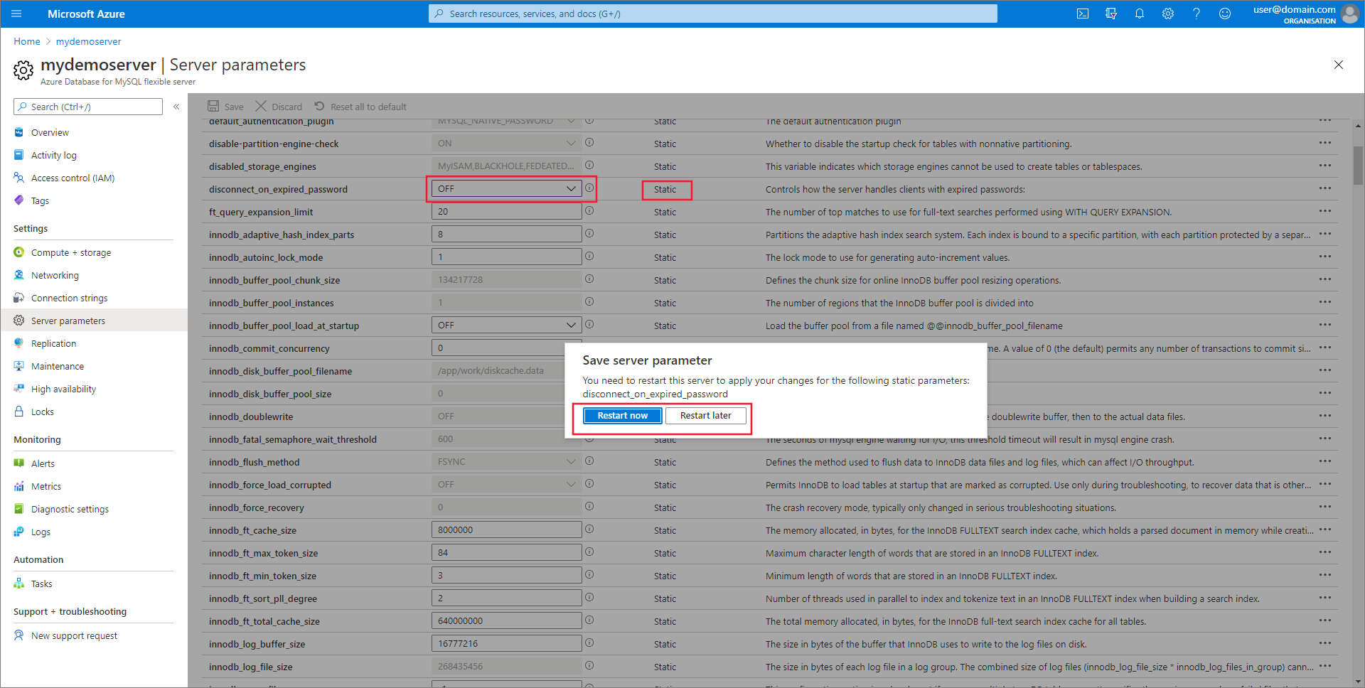 - 静态参数需要重启服务器才会生效。 如果修改静态参数,系统将提示你立即重启或稍后重启。