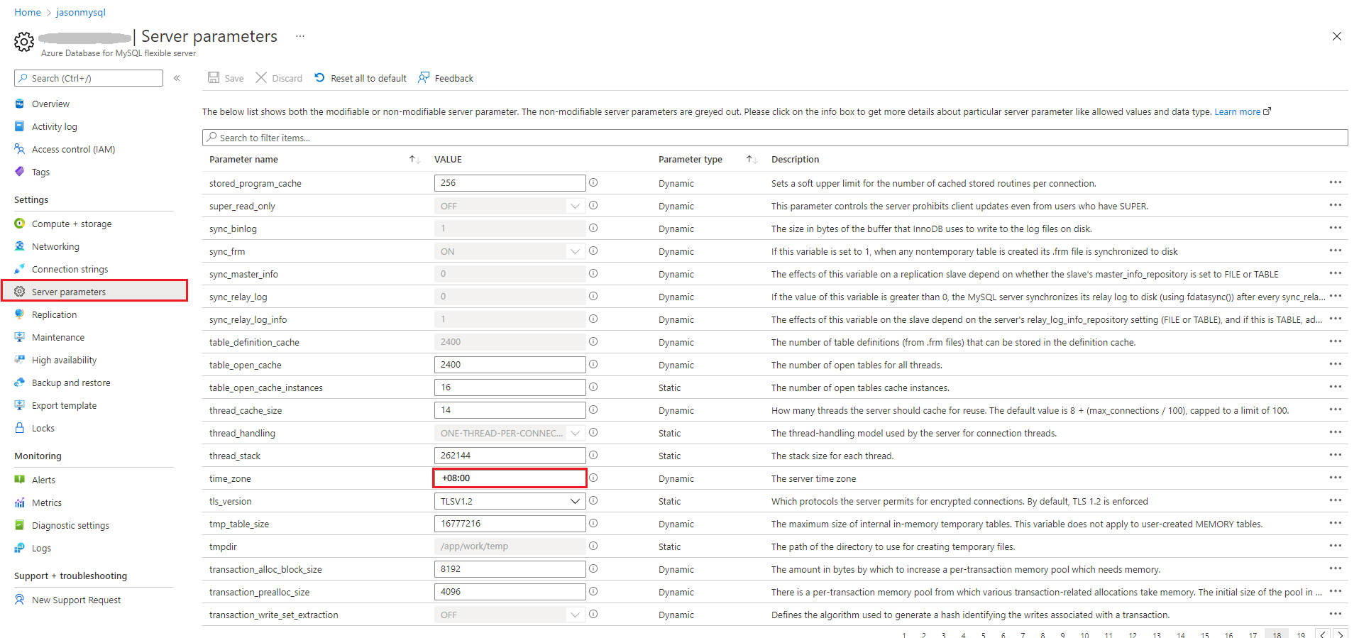 可以从 Azure 门户中的“服务器参数”页设置全局级时区。 以下示例将全局时区值设置为“+08:00”。