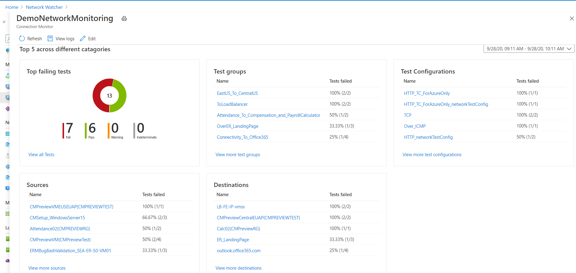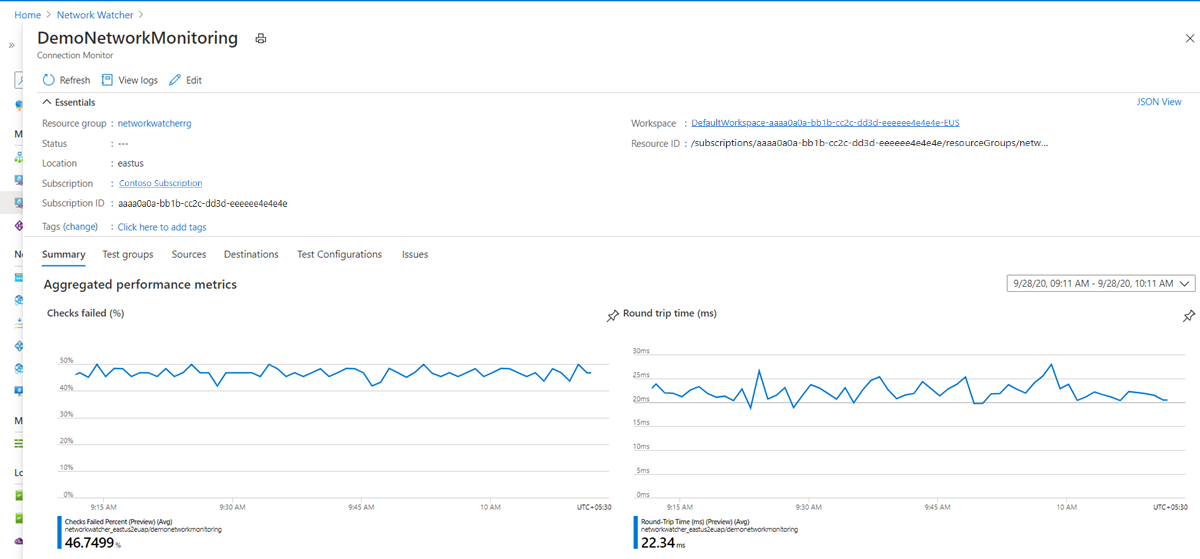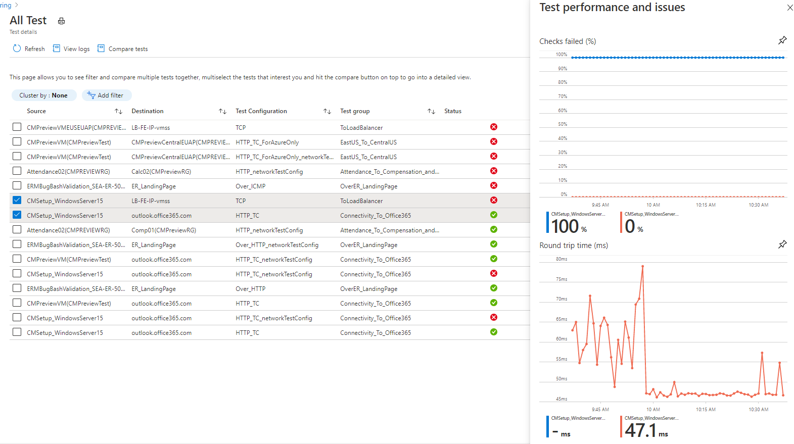 测试:将源终结点、目标终结点和测试配置组合在一起。 测试是提供监控数据的最细致级别。 监视数据包括检查失败的百分比和往返时间 (RTT)。