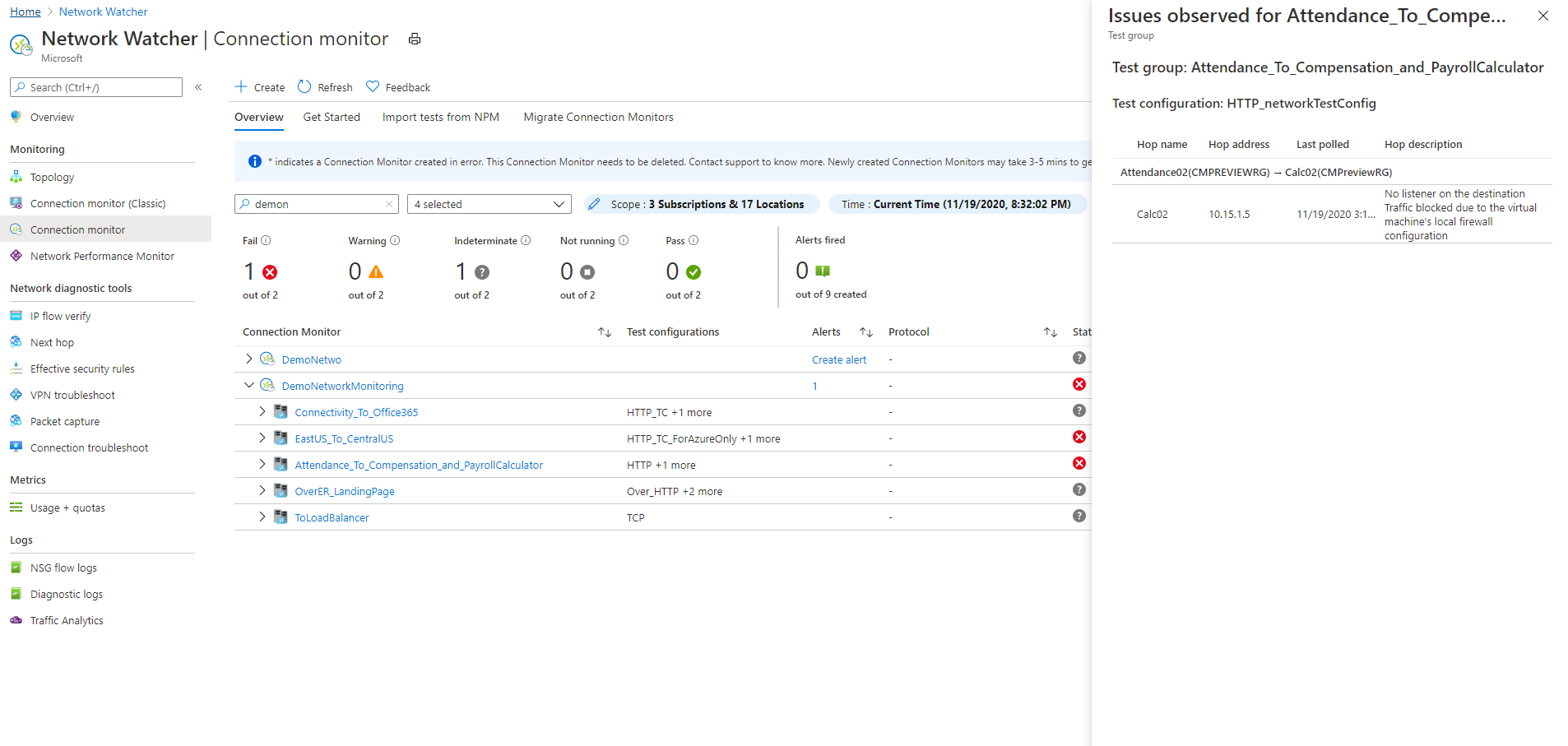 连接监视器可以帮助你诊断连接监视器中的问题和网络中的问题。 前面安装的Log Analytics代理检测到混合网络中的问题。 Network Watcher扩展检测到Azure中的问题。