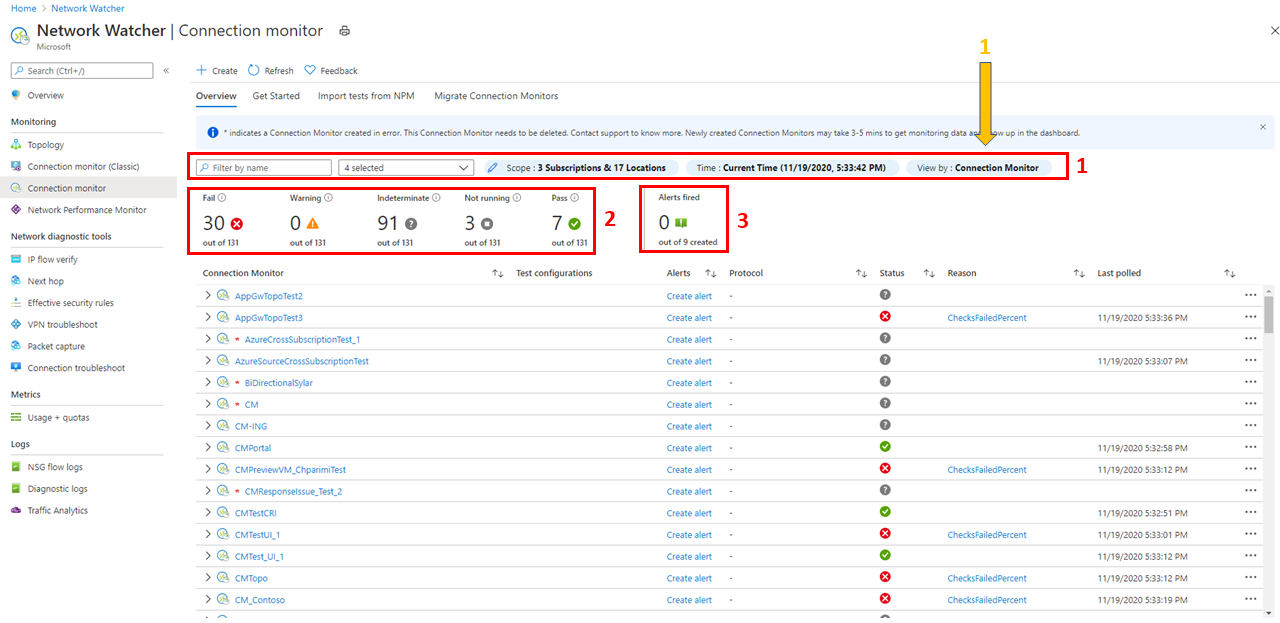 此时会显示在连接监视器中创建的所有连接监视器。 若要查看在经典连接监视器体验中创建的连接监视器,请选择“连接监视器”选项卡。