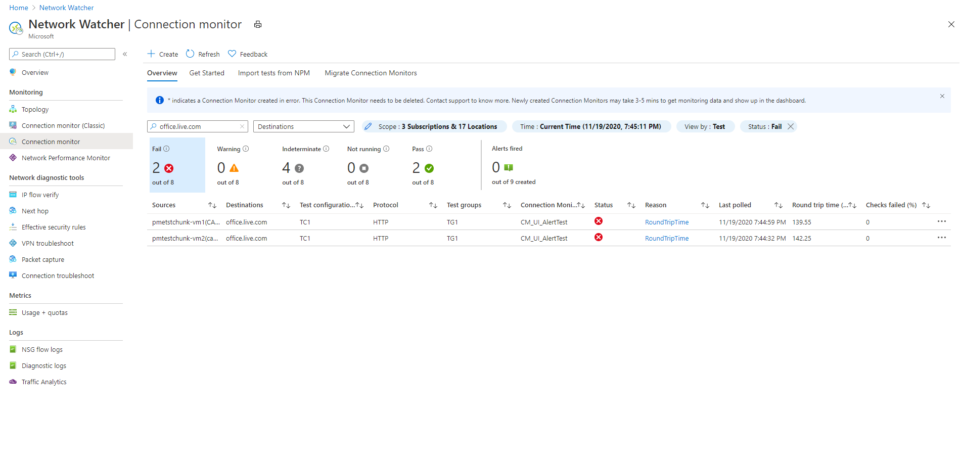 创建连接监视器后,源会根据测试配置来检查与目标的连接。