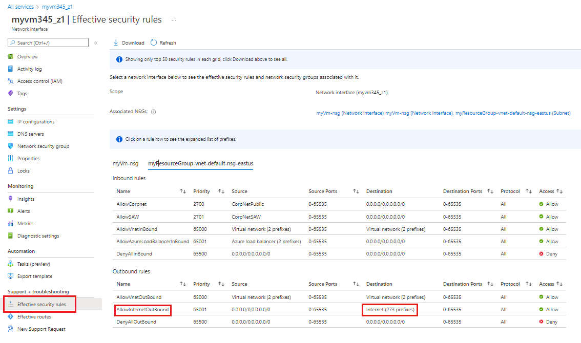 要确定上一部分中的规则允许或拒绝通信的原因,请查看 myVM 虚拟机中网络接口的有效安全规则。
