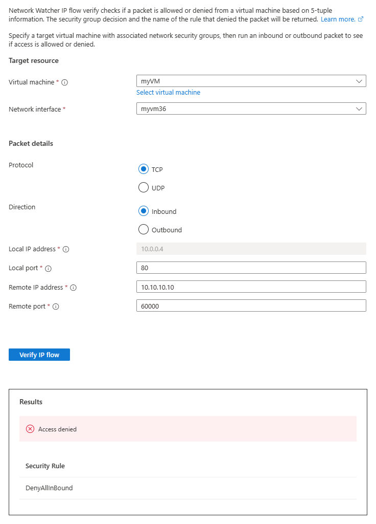 将“方向”更改为“入站”,将“本地端口”更改为“80”,将“远程端口”更改为“60000”,然后重复测试。 第四次测试的结果表明,由于默认安全规则 DenyAllInBound,拒绝来自 10.10.10.10 的访问。