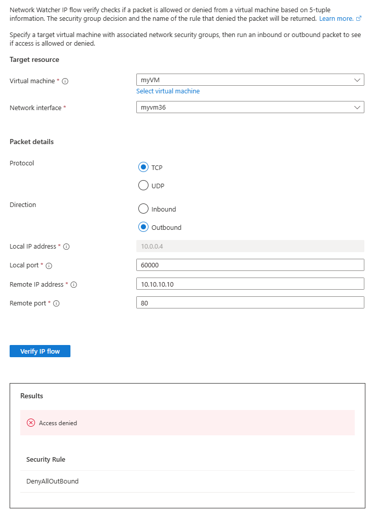 将远程 IP 地址更改为 10.10.10.10 并重复测试。 第三次测试的结果表明,由于默认安全规则 DenyAllOutBound,拒绝访问 10.10.10.10。