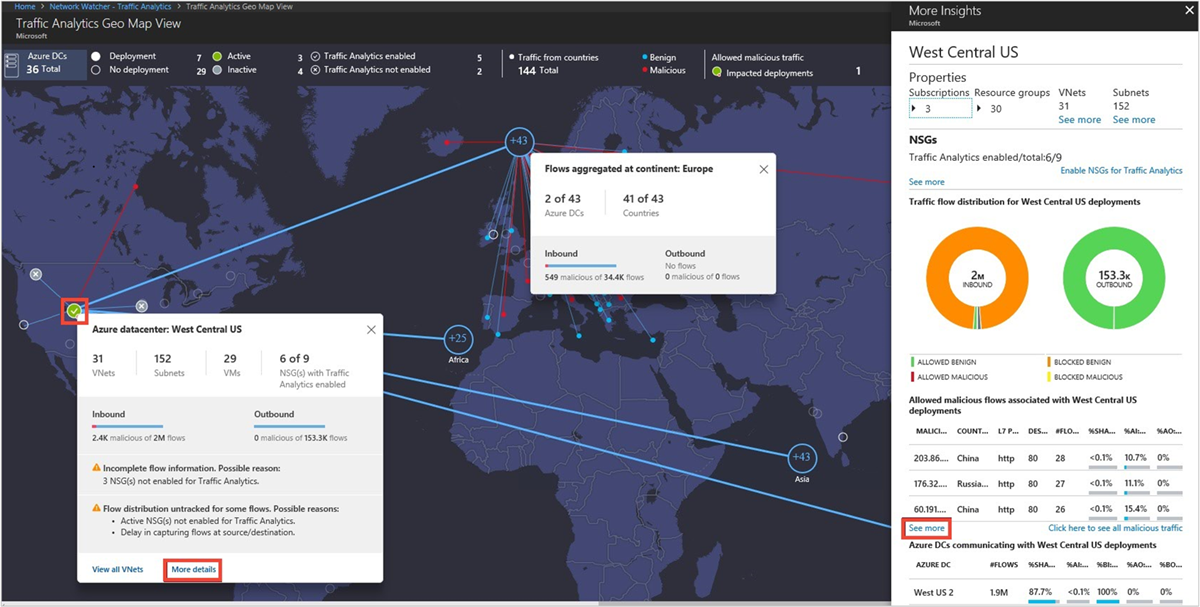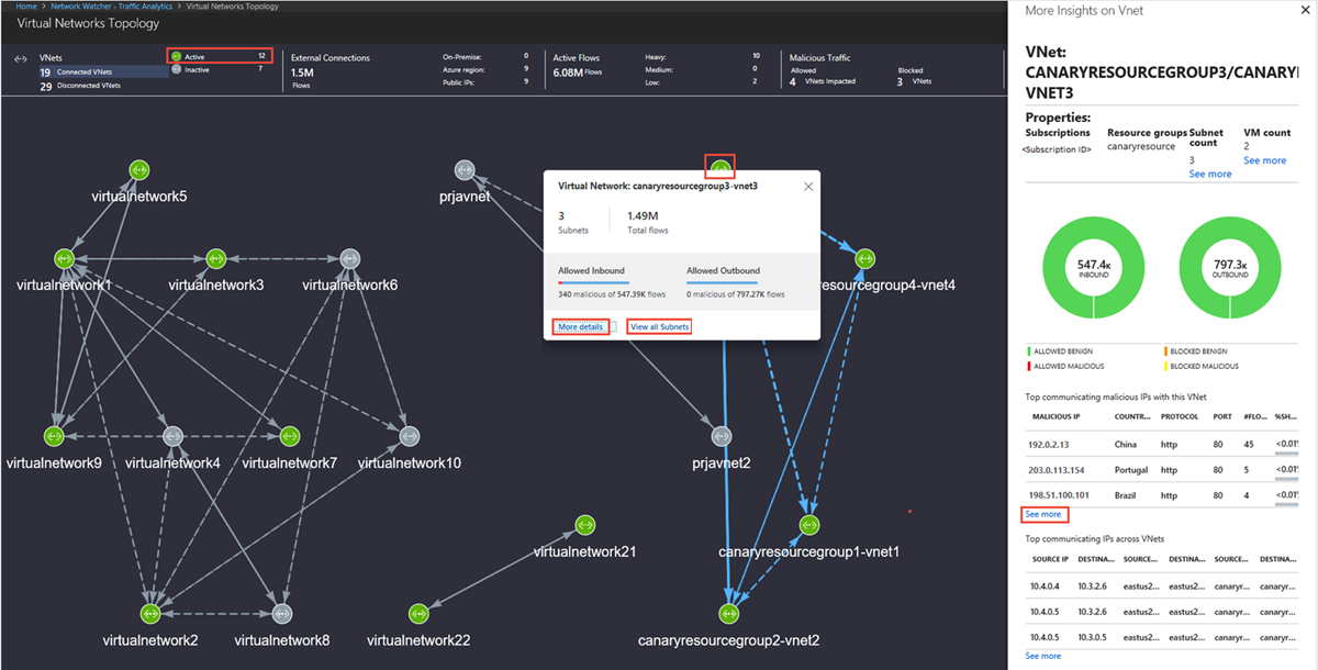 - 哪些主机、子网、虚拟网络以及虚拟机规模集正在发送或接收最大流量、遍历最高恶意流量并阻止显著流动?