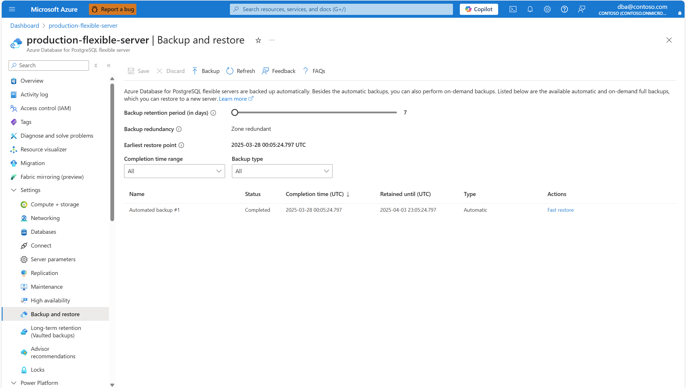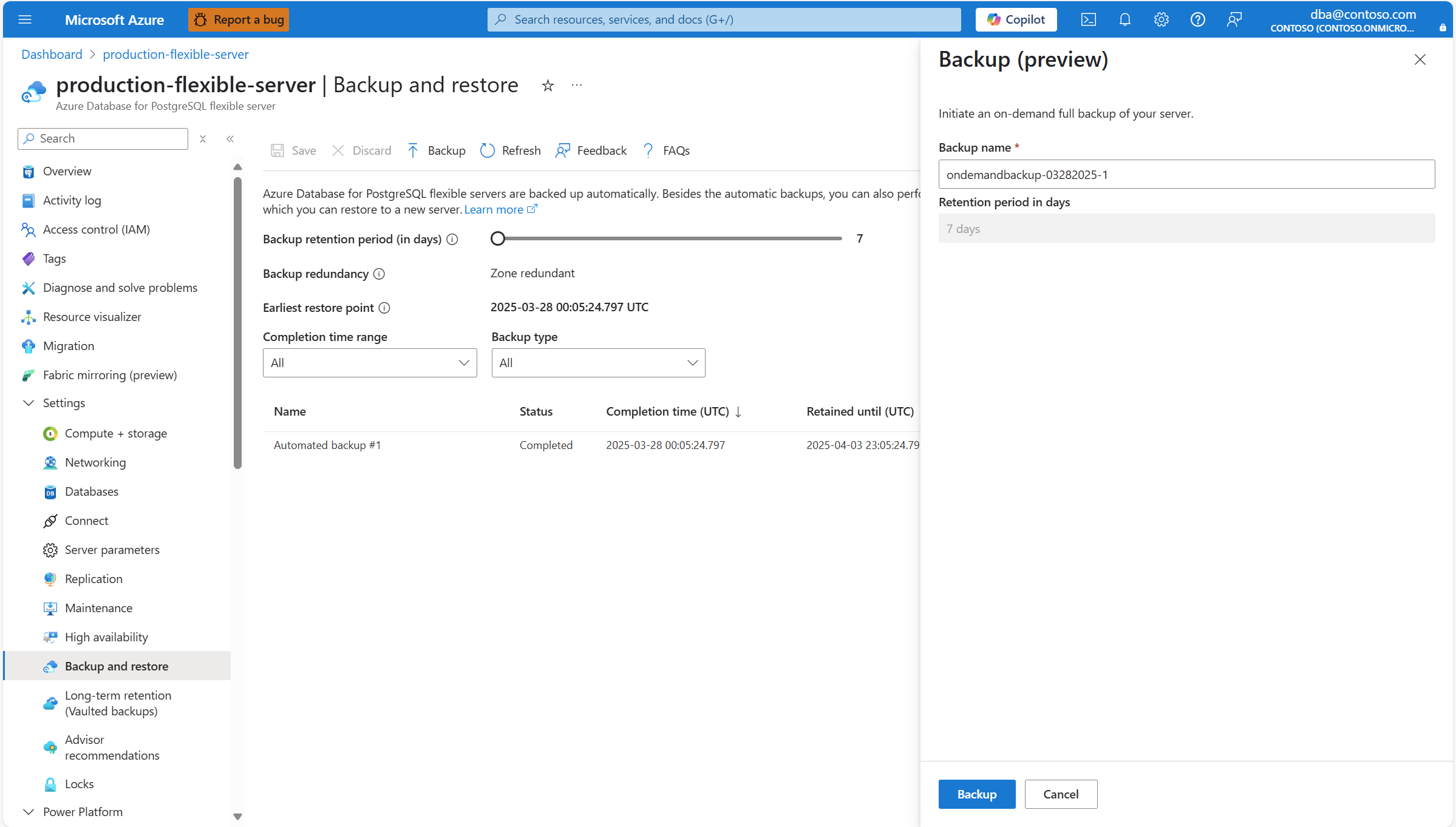 本文提供对 Azure Database for PostgreSQL 灵活服务器执行按需备份的分步说明。