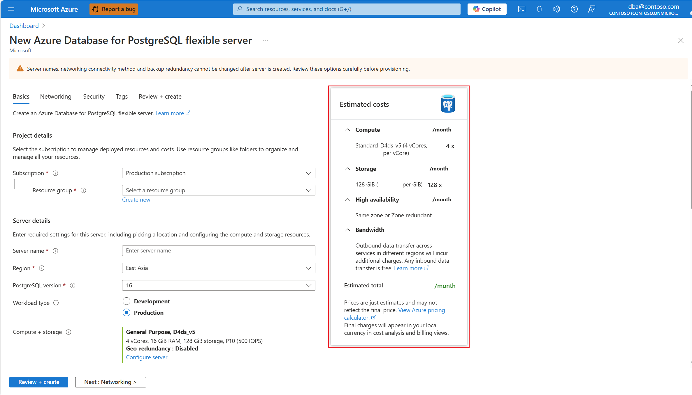 在“新建 Azure Database for PostgreSQL 灵活服务器”页中,可以在整个服务器创建体验期间查看该估算: