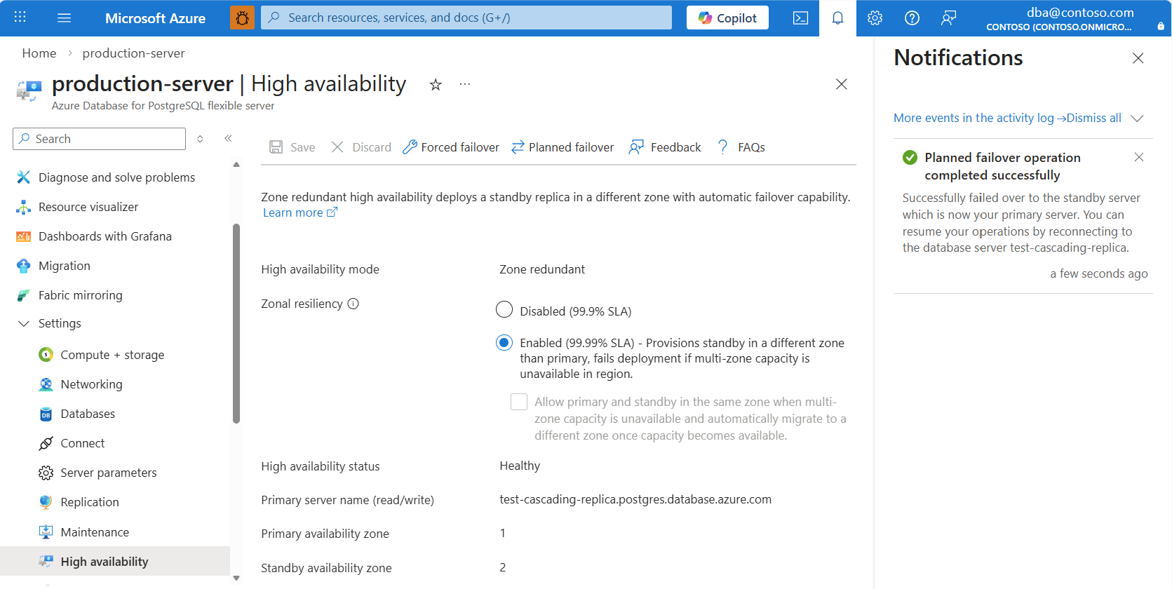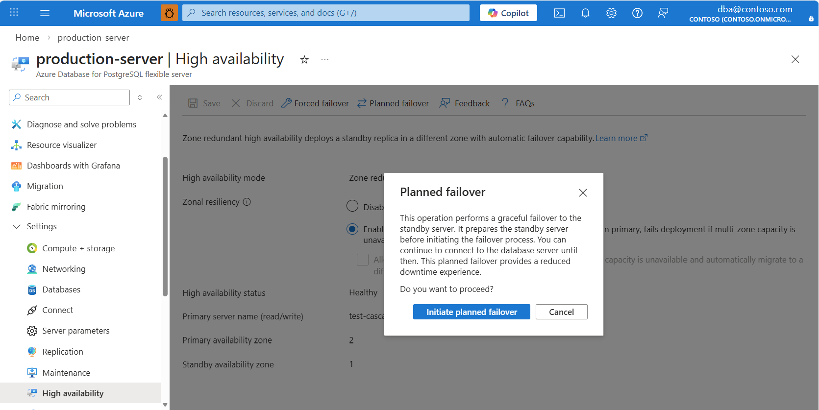 请按照以下步骤在 Azure Database for PostgreSQL 中执行计划故障转移,从主服务器切换到备用服务器。 启动此操作会准备备用服务器,然后执行故障转移。
