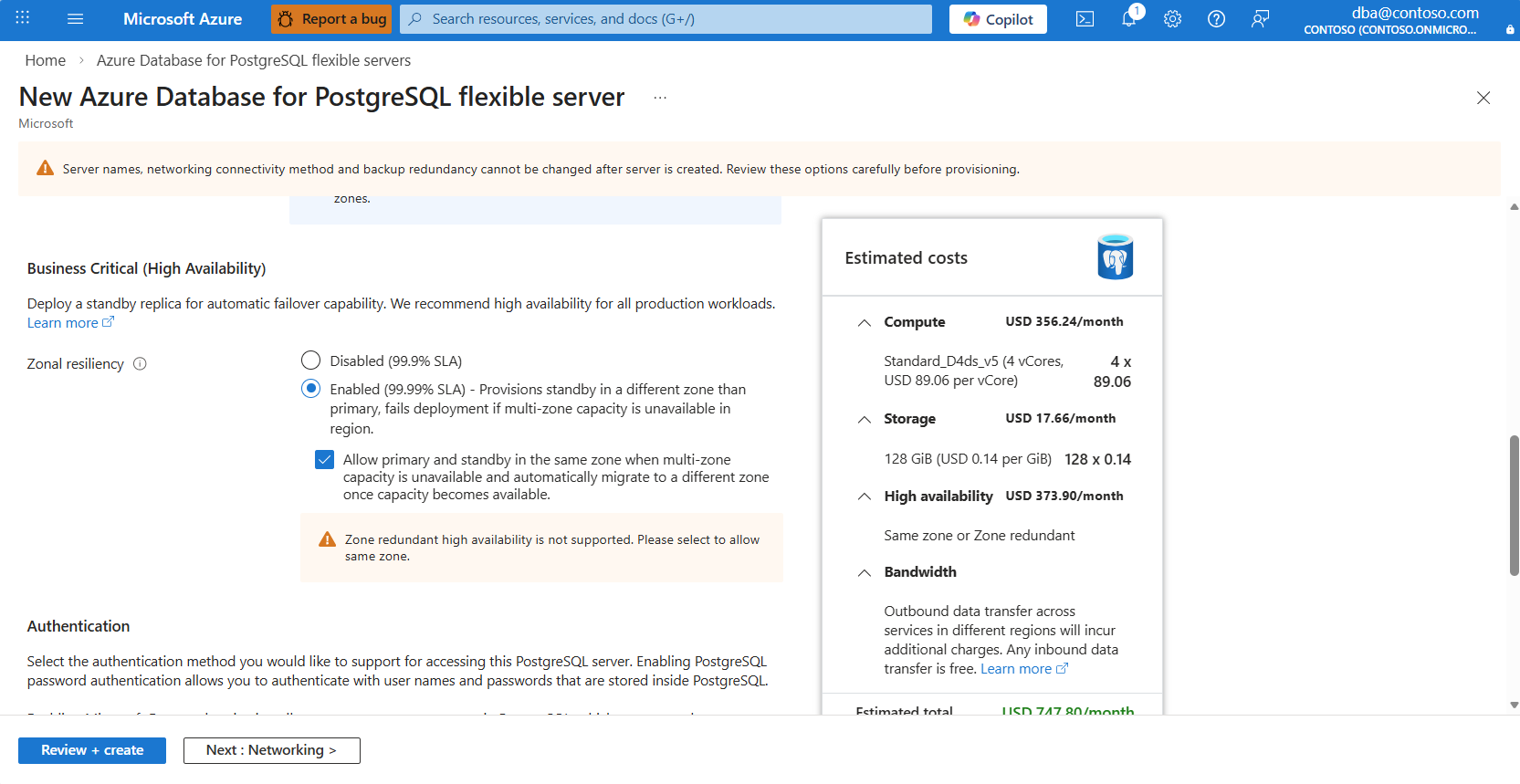 • 如果你在包含单个可用性区域的地区中部署服务器,则只能在“同一区域”模式下启用高可用性。 如果将来使用多个availability zones增强区域,则可以部署具有高可用性且配置为同一区域或区域冗余的新Azure Database for PostgreSQL灵活服务器实例。
